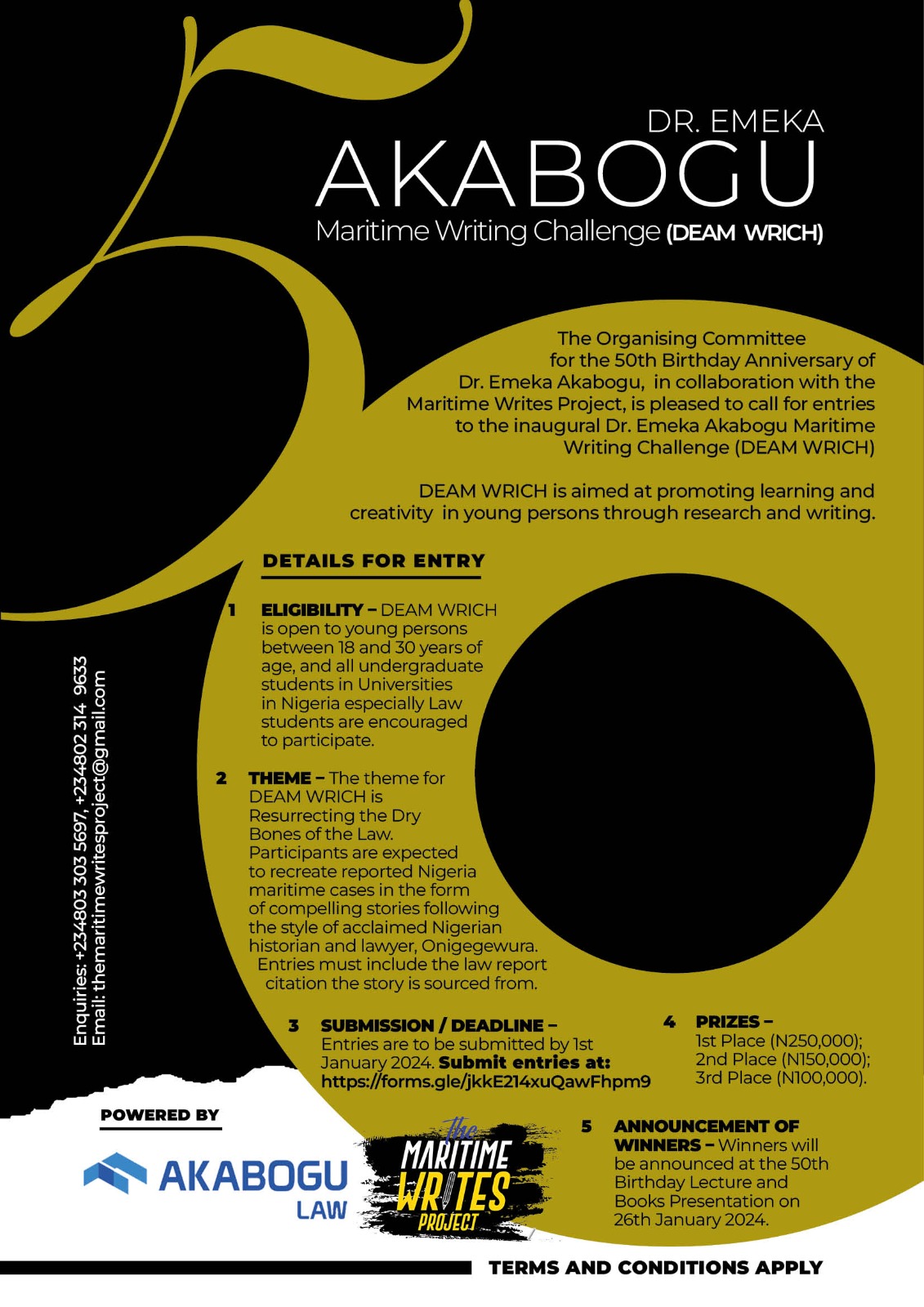 The writing contest will be the inaugural edition of Dr. Emeka Akabogu Maritime Writing Challenge (DEAM WRICH) and it is being organized by the Maritime Writes Project, in collaboration with the Organizing Committee for the 50th birthday anniversary of Dr. Akabogu.